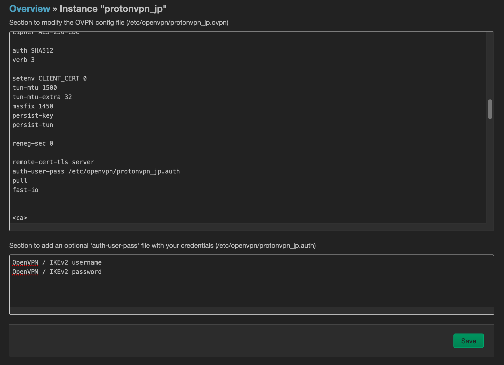 We will then use the OVPN configuration file upload, and give it the configuration file provided by ProtonVPN. The configuration will then appear in the list of OpenVPN instances, and we will edit it. You should add the path of the auth-user-pass file in the top text field, and put your username/password in the second one.