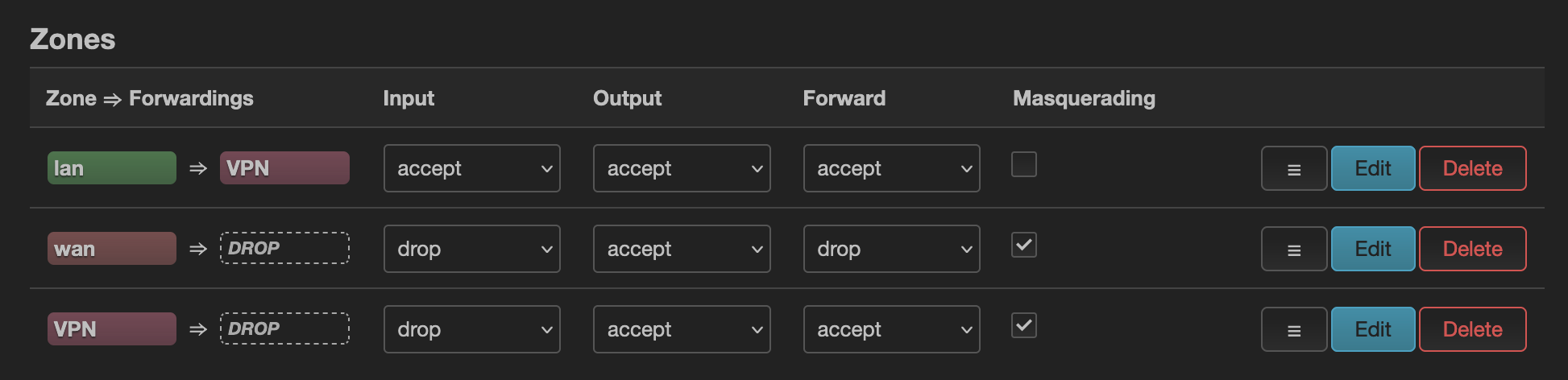 Then, we will configure a new interface for the VPN. In Network/Interface, add a new Interface tun0, with protocol as Unmanaged, Bring up on boot, and tun0 as the device. In Firewall Settings, create a firewall-zone VPN. We will then configure this zone in Network/Firewall with the same settings as wan => DROP, with the difference that we will use lan in Allow forward from source zones, and accept the Forward. We will also go to the lan => VPN zone, and add the VPN zone in the Allow Forward. You should now have the following: