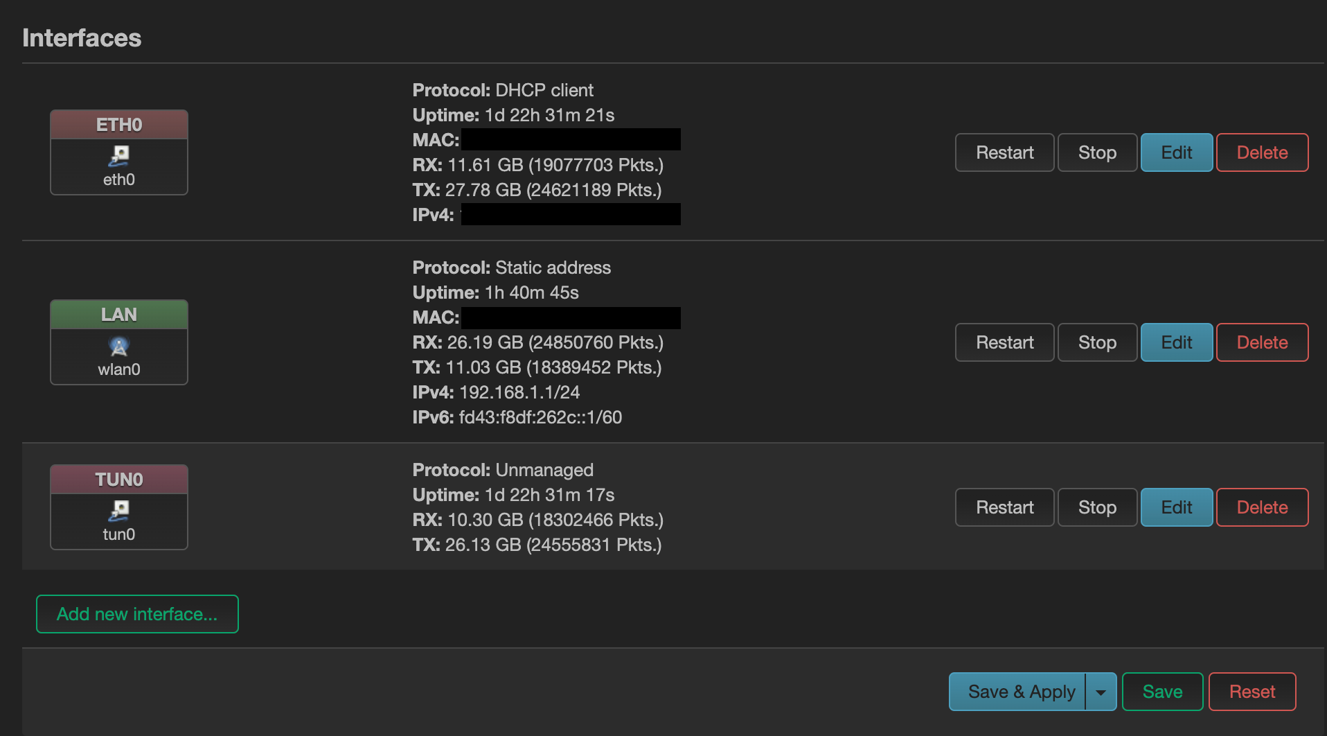 The final step before being able to use the WiFi is to configure the interfaces in Network/Interfaces. By default, you should have a single Interface br-lan, or something of the kind. We will edit this interface to have the following: