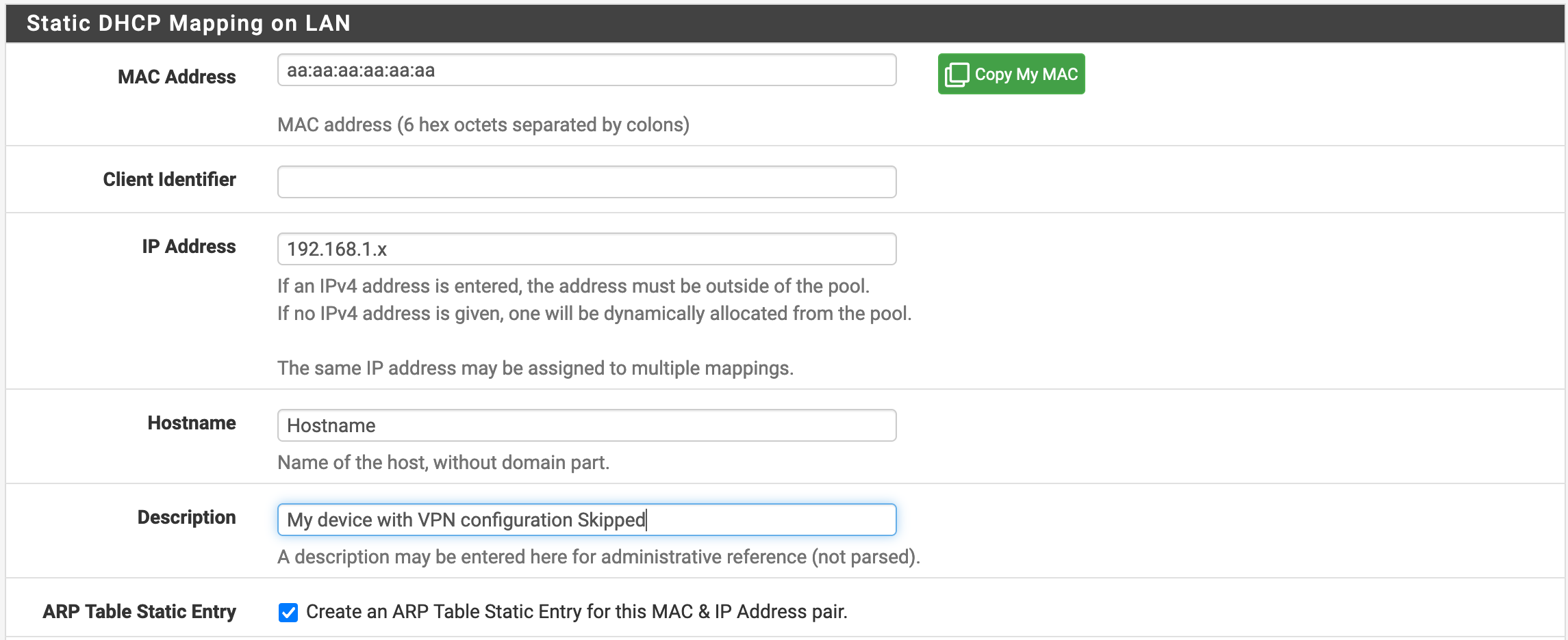 If you want all of your machines to use a VPN to connect to the Internet and to use pfBlockerNG, you can skip this step. Basically, we want to ensure that the machines connected to the network will always have the same IP address so that we can configure specific rules for them (i.e. you don’t need to do that for machines that you don’t want to set up special rules for.)