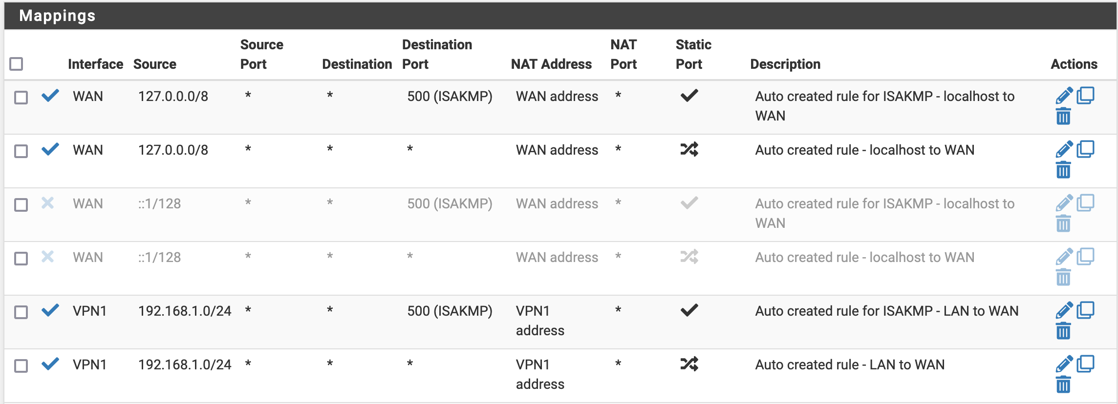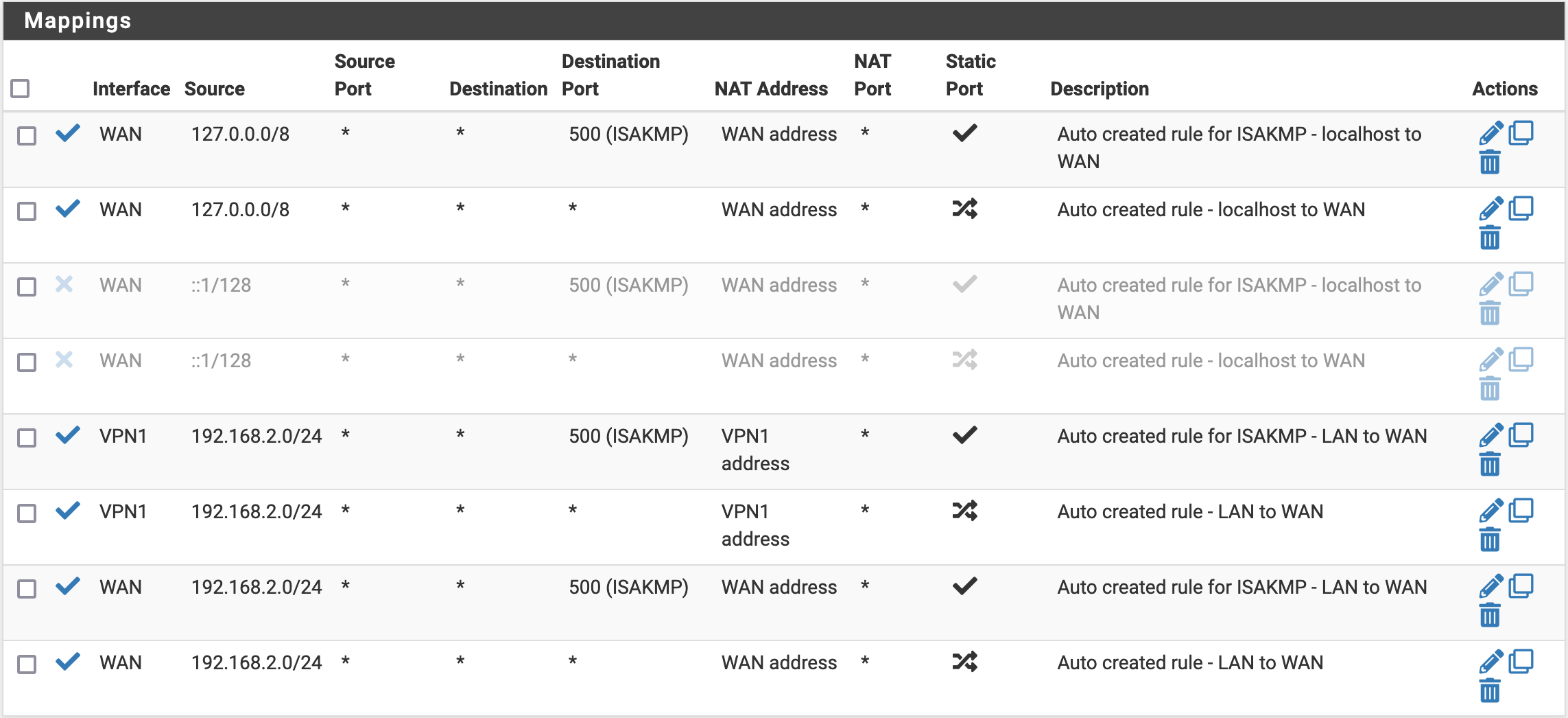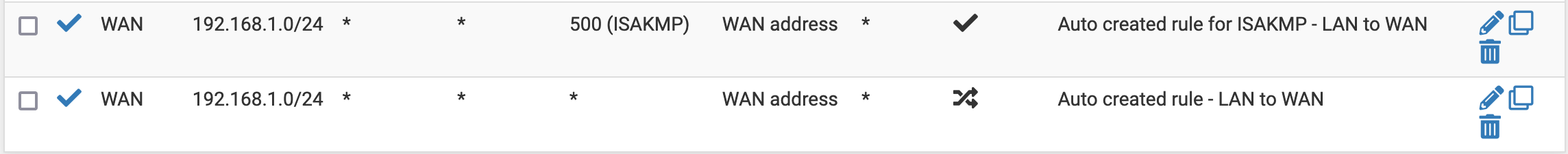 If for some reason you want to have a device connecting to the Internet directly, we can allow that by configuring a couple of rules. First, we need to do some Firewall/NAT/Outbound configuration. We will actually make a copy of the rules we changed before, but this time put (back) WAN as an interface. In the end, you should have the following rules.