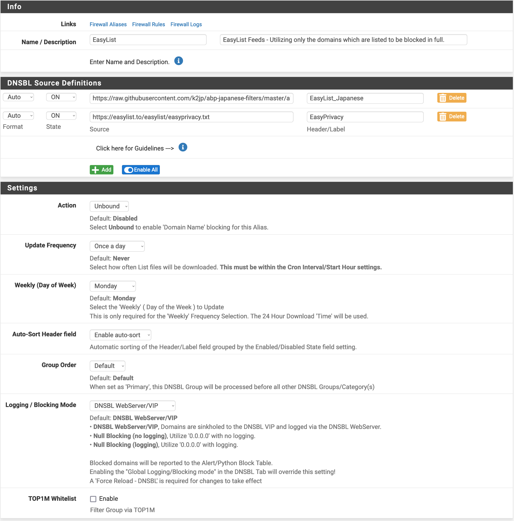 In this submenu, we can configure groups of lists, and how much you want to have them refreshed. For example, if we configure DNSBL to use the EasyList, which is quite popular with AdBlockers, you should have something as follows.
