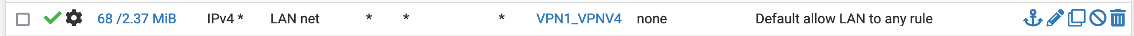 Then, in Firewall/Rules/LAN, we make sure to disable the IP v6 rules (icon on the right) and change the Default allow LAN to any rule rule to use our VPN1 interface as a gateway.
