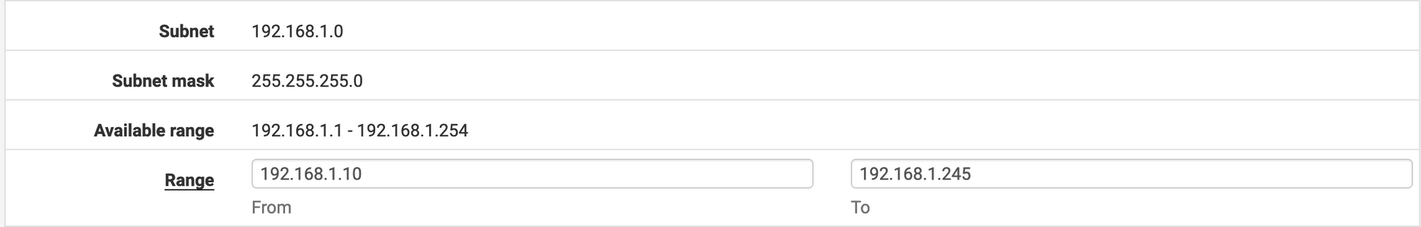 We will edit the range so that the IPs assigned by DHCP are from 192.168.1.100 to 192.168.1.245. This will allow us to manually assign an IP between 192.168.1.2 and 192.168.1.99 to our machines.